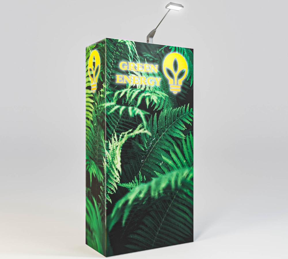 Sześcienny system ekspozycyjny zaprojektowany do dwustronnych prezentacji i zapewniania wysokiego efektu wizualnego. System można również podświetlić, aby poprawić widoczność i widoczność marki.