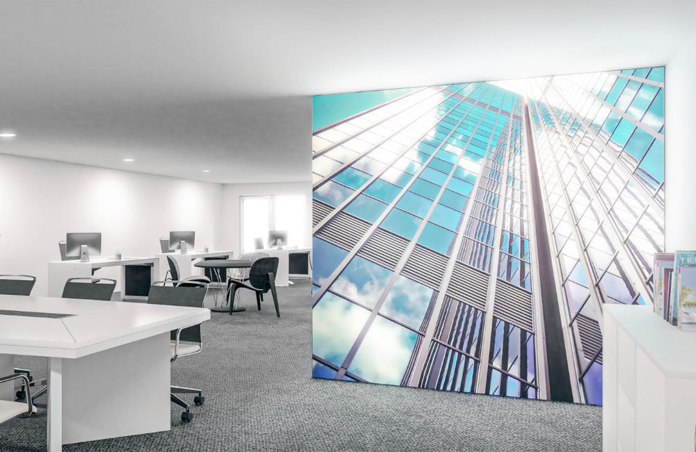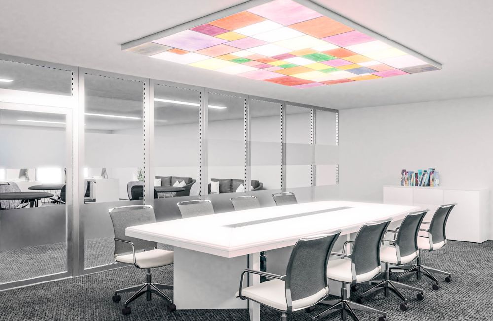 Installed Matrix Lightbox ceilings transform any space — from living rooms to offices and lobbies — creating a completely new atmosphere. Choose your own custom-printed textile design to bring warmth, color, and emotion into the room. Our modular frame system adapts to any layout and size, ensuring seamless integration with your interior design. Each light ceiling features a high-quality color print on textile (example size: 1984 x 2976 mm) and a dimmable LED lighting system with remote control. The result: a bright, elegant, and energy-efficient ceiling solution that enhances well-being and elevates any environment.